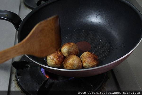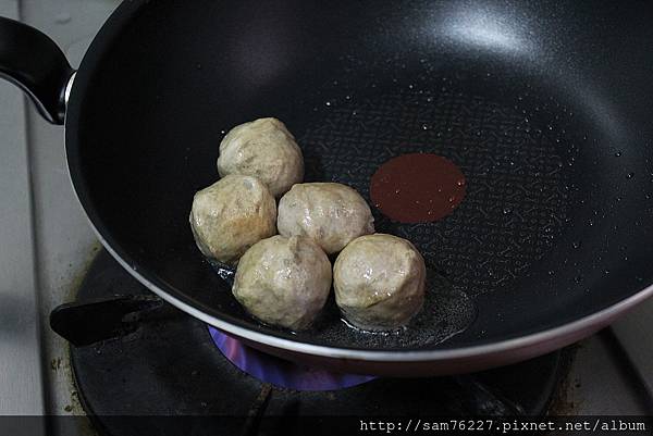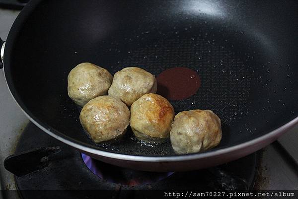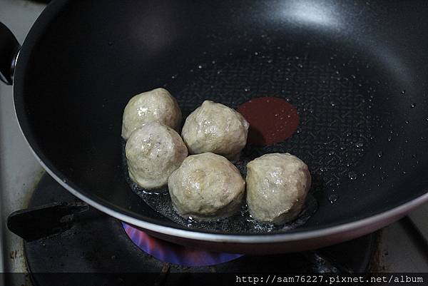 這樣的貢丸就差不多了~小火煎~記得要翻滾貢丸~貢丸的體積也會變大~
